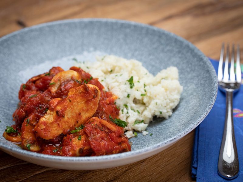 Roughly chop the parsley. Drain and mash the cauliflower with a potato masher. Stir in the parsley, add the knob of butter and season to taste. Remove the bay leaf from the chicken chasseur and discard.